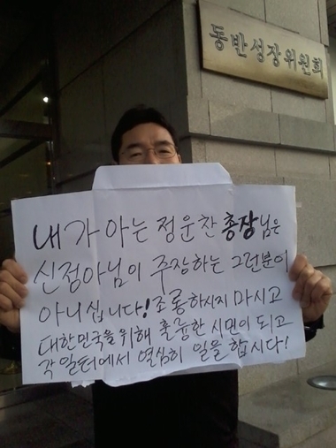 유 씨가 들고 있는 피켓에는 “내가 아는 정운찬 총장님은 신정아님이 주장하는 그런분이 아니십니다. 조롱하시지 마시고 대한민국을 위해 훌륭한 시민이 되고 각 일터에서 열심히 일을 합시다”라는 문구가 새겨졌다.