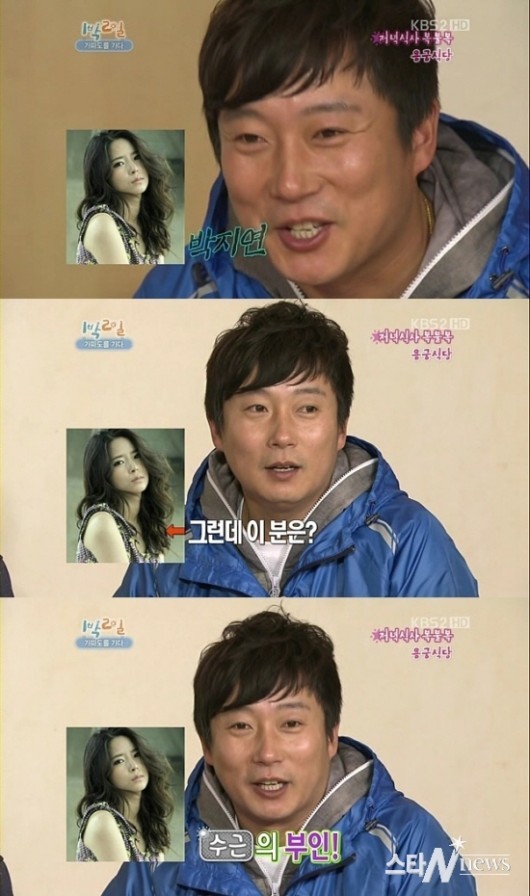 이수근은 “내 와이프를 꼭 여기서 까지 만나야 하냐”며 자신의 아내임을 밝혔다. 이에 강호동은 연예인으로 착각했다며 박지연 씨의 미모에 감탄한 것.