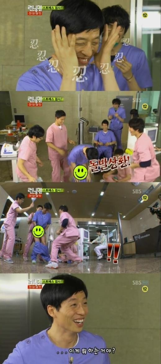 이에 멤버들은 아연실색 하며 이어진 스트레스 검사에서 김종국은 자신에게 야식을 먹인 유재석에게 갑작스러운 하의탈의 복수를 했다.