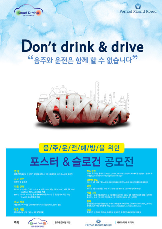 음주운전예방재단(이사장 전여옥)과 페르노리카 코리아(대표 프랭크 라뻬르)는 12일부터 음주운전 예방을 주제로 포스터 및 슬로건 공모전을 공동으로 실시한다고 밝혔다.
