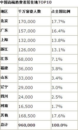 지역별로는 베이징에 17만명의 천만장자와 1만명의 억만장자가 있어 홍콩,타이완,마카오를 제외한 31개 성?시중 가장 많았다.