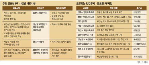 대림산업이 주간사인 상주∼영천고속도로의 경우 금융권 수익률 보장 문제로 사업추진이 지연되고 있으며 창원∼마산고속도로(주간사 현대건설)는 지난해 착공했지만 PF가 안돼 애로를 겪고 있다.