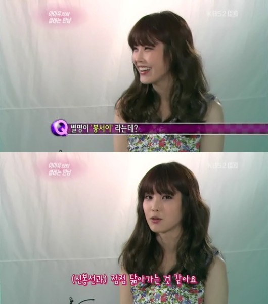 인터뷰를 통해 아이유에게 “별명이 ‘봉서이’다”고 운을 띄우자 아이유는 웃으며 “맞아요. 닮아가는 것 같아요. 점점 더”라고 대답해 신봉선 닮은꼴임을 인정한 것.