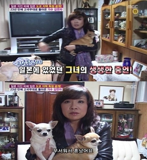 일본 대지진 당시 김연자는 "강아지들을 안고 테이블 밑에 숨어있었다. 장식장 안에 있는 물건들은 다 무너졌다. 장식장 위에 있던 액자들도 다 떨어졌다"며 그 날을 떠올리며 생생한 증언을 했다.