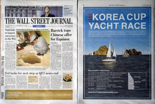 ‘독도 지킴이’ 가수 김장훈과 한국홍보전문가 서경덕 성신여대 객원교수가 미국 유력지 월스트리트저널에 ‘2011 코리아컵국제요트대회’를 알리는 전면 광고를 게재했다.