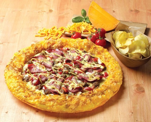 크런치 골드는 도우에 바삭한 감자칩과 고소한 체다치즈를 얹었다.