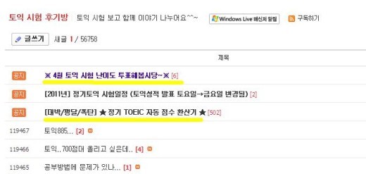 | ▲ 다음카페 ‘닥치고 취업’에 토익 난이도 투표와 토익 자동점수 환산기에 대한 게시물이 게재돼 있다. |