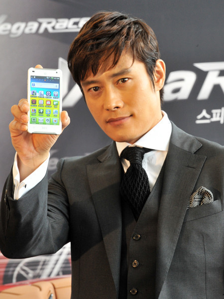 ■사진설명=팬택은 19일 서울 상암동 팬택 연구개발(R&D)센터 1층에서 스마트폰 '베가 레이서(Vega Racer)' 출시 기자간담회를 개최했다. 스피드의 대명사 페라리를 배경으로 '베가 레이서' 광고모델 이병헌이 포즈를 취하고 있