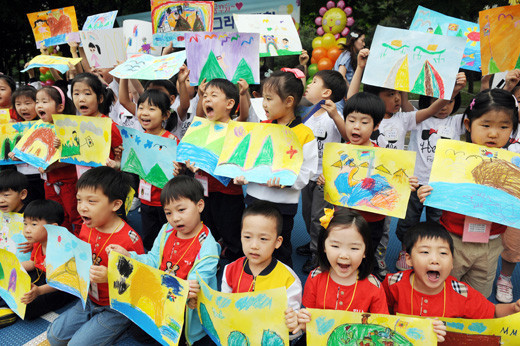 서울 서초구청이 관내 어린이집 및 유치원생들을 대상으로 26일 서울 잠원동 명주근린공원에서 개최한 '어린이 그림그리기 대회'에서 참가 어린이들이 독도를 주제로 그림을 그린 후 '독도는 우리땅'을 외치고 있다.