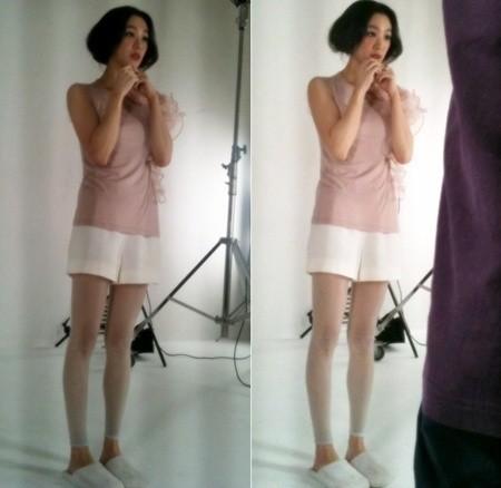 이번에 공개된 사진은 정려원의 패션매거진 화보 촬영장에서의 직찍 사진으로 슬리퍼를 신고 있음에도 마르고 곧게 뻗은 일자다리와 군살 없는 마론 인형 몸매를 뽐내고 있다.