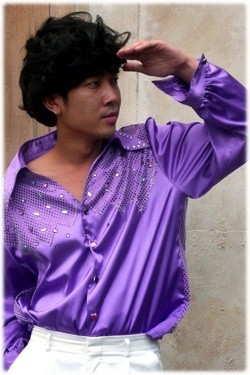 사진 속 고영욱은 화려한 큐빅이 박혀 있는 연보라색 셔츠와 하얀 색 바지를 입고 있으며 70년대를 연상시키는 촌스러운 가발을 쓰고 한껏 포즈를 취하고 있어 웃음을 자아낸다.