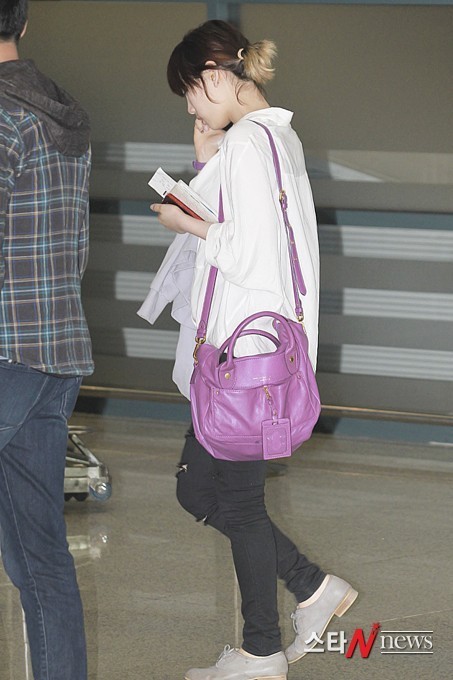그녀는 바이올렛 컬러의 빅백과 시계로 포인트를 주었으며 그레이 컬러의 옥스퍼드 구두로 심플함을 깨고 상큼 발랄한 공항패션을 완성했다.