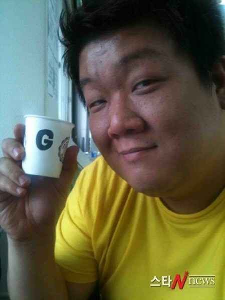 사진 속 유민상은 가슴 사이즈가 G컵이 아닌 굵은체로 G라고 써놓은 종이컵을 한손으로 들고 미소를 짓고 있다. 말 그대로 ‘G컵’이다.