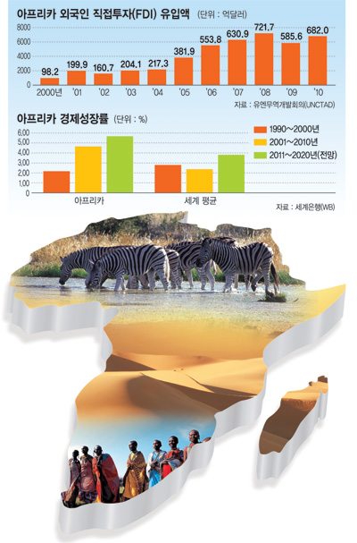 아프리카에 대한 외국인직접투자(FDI)도 증가하고 있다. 유엔무역개발회의(UNCTAD)에 따르면 지난 2000년 아프리카에 대한 FDI는 98억2000만러(약 10조6000억원)에 불과했으나 2008년 721억7000만달러(약 78조2000억원)로 8배 가까이 급증했다. 글로벌 금융위기로 지난 2008년 전 세계에 대한 FDI는 20% 급감했지만 아프리카에 대한 FDI는 오히려 16.8% 늘었다.