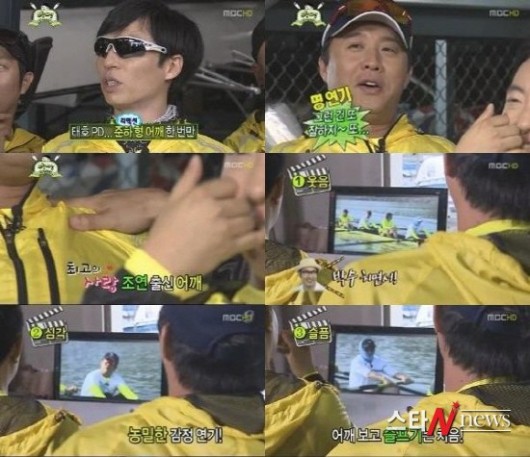 모니터 도중 유재석은 정준하에게 “어깨 연기 한 번 보여달라”고 부탁했다. ‘어깨 연기’는 정준하가 출연한 드라마 ‘최고의 사랑’에서 정준하의 얼굴이 아닌 어깨만 나온 것을 장난스럽게 표현한 것.