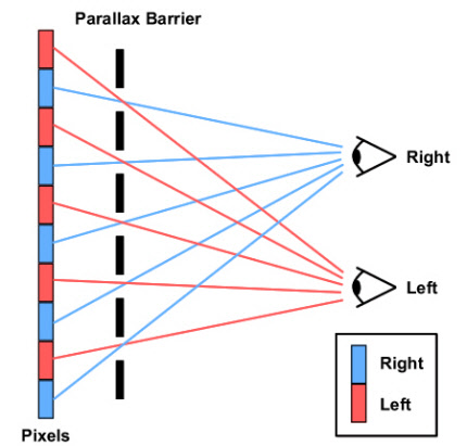| 3D FORUM에서 설명하는 Pallallax Barrier방식. 최근 많은 무안경 3D 디스플레이가 이 방식을 채택해 제품을 출시하고 있다. |