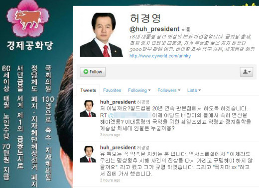 경제공화당 총재 허경영의 이름으로 트위터(@huh_president)가 개설돼 화제가 되고 있다. 23일 개설한 이 트위터는 24일 오후 5시 현재 668명의 트위터러가 팔로우하고 있다.