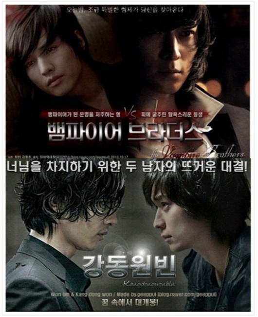 공개된 포스터에는 영화 '뱀파이어 브라더스'와 '강동원빈'이라는 제목으로 두 사람의 사진을 절묘하게 편집해 마치 영화 포스터를 연상케해 눈길을 끌고 있다.