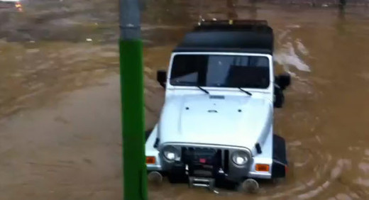 누리꾼‘kabria*****’가 지난 26일 유투브에 게재한 동영상에는 침수된 거리의 모습이 담겨있다. 여러 대의 차가 물에 잠겨있는 모습을 담고 있는 이 영상에서 반쯤 물에 잠겨있는 지프 랭글러의 모습이 눈에 띈다.