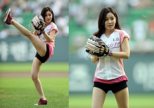 앞서 29일 서울 잠실야구장에서 열린 2011 롯데카드 프로야구 LG트윈스와 삼성라이온즈의 경기 앞서 시구자로 나선 남규리는 핑크컬러의 LG트윈스 유니폼 상의와 핑크색 티셔츠, 아찔한 핫팬츠 차림으로 경기장에 모습을 드러낸 것.
