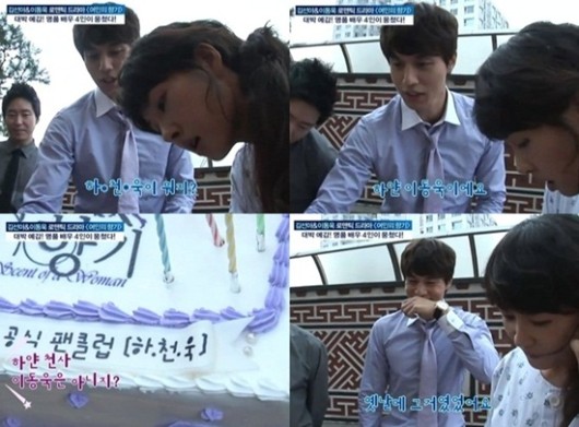 이에 김선아는 “하천욱이 뭐지”라고 고민했고 이러한 김선아에게 이동욱은 “하얀 이동욱”이라고 대답하며 쑥쓰러워 했고, 출연자들은 케이크 앞에서 즐거워 하는 모습을 보였다.