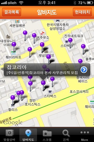 ‘맞춤알바’ 앱의 추가기능은 ‘알바지도 서비스’와 ‘알바정보 공유 서비스’. 알바몬은 근무할 기업의 위치 정보만 제공하던 지도서비스를 한층 발전시켜 업계 최초로 위치정보를 기반으로 한 채용정보 검색 서비스까지 제공한다.