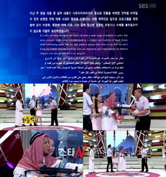 앞서 지난 13일 방송에서 사우디아라비아에서 온 소녀 루비의 출연 당시 사우디아라비아인의 복장을 한 출연진이 총을 들고 무대에 올라 강호동에게 총을 겨누는 등 사우디아라비아인들을 테러리스트로 묘사해 오해를 낳았던 것.