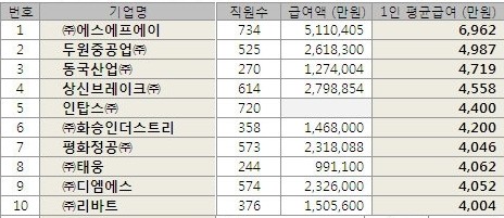 공개 대상 총 25개 기업 중 (주)에스에프에이가 6962만원으로 평균연봉이 가장 높았다. 두원중공업 4987만원으로 뒤를 이었으며 동국산업 (4719만원), 상신브레이크 (4558만원), 인탑스 (4440만원) 순으로 나타났다.