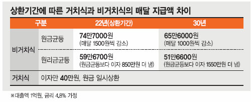 예를 들어 코픽스 6개월 변동금리 4.8%(은행 우대금리 적용)로 1억원을 대출받을 경우 월 이자는 약 40만원이다. 이를 비거치식 대출로 전환하고 상환기간을 22년에서 30년으로 늘리면 늘어나는 부담은 월 10만원 안팎이란 게 은행측 설명이다. 은행권 관계자는 "만기를 35년까지 늘리는 방법 등으로 부담을 더 줄이는 방안을 연구하고 있다"고 말했다.