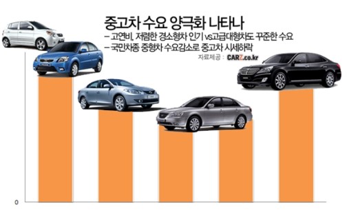 중고차 전문업체 카즈에 따르면 중형급 중고차 시세는 하락하고 있는 반면 고급대형차나 경차는 안정적인 수요와 가격을 유지하고 있는 것으로 나타났다.