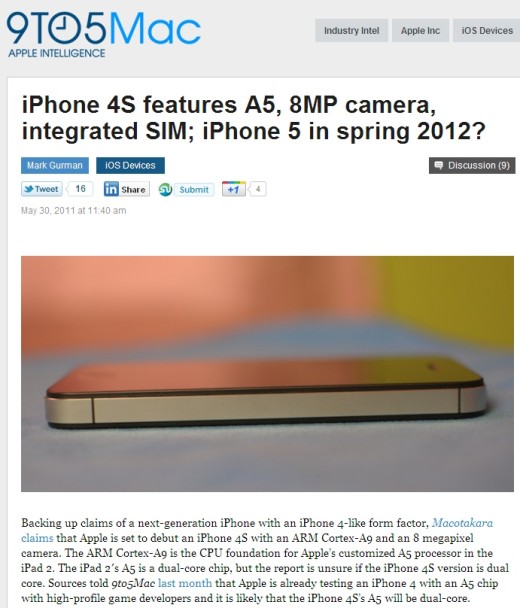 미국 애플 관련 전문 블로그인 ‘나인투파이브맥(9to5Mac)’은 지난 5월30일 일본 IT 전문 블로그인 맥오타카라를 인용해 “애플의 차세대 아이폰은 아이폰4S가 될 것”이라고 전한 바 있다.
