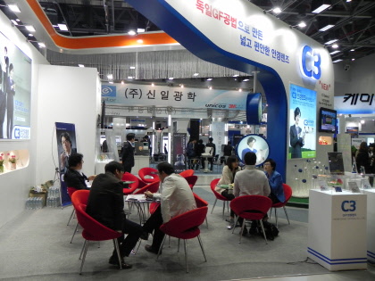 | 행사장에서 한미스위스광학 부스를 찾은 바이어들의 상담이 활발히 펼쳐지고 있다. |