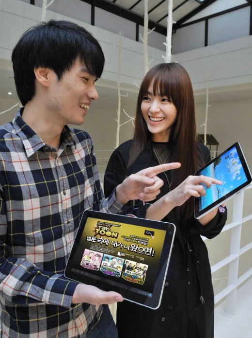 탭툰은 온라인만화를 일컫는 웹툰에 음악 요소를 가미시켜 태블릿PC ‘갤럭시탭10.1’로 제작하는 만화. 보는 독자들이 이야기에 함께 참여할 수 있는 양방향 속성을 가지고 있다.
