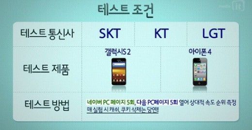 테스트는 두 가지 스마트폰(애플 아이폰4, 삼성전자 갤럭시S2)으로 포털 사이트 네이버와 다음 페이지를 각 5회씩 열어 상대 속도를 측정하는 방식으로 이뤄졌다. 측정한 위치는 명동, 홍대거리, 강남역, 3사 통신사 건물 앞 등 서울 지역 15곳이다.