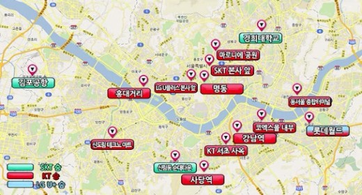 지역별로는 김포공항, 신림동 순대타운, 경희대학교 등에서는 SKT, 잠실 롯데월드 부근에서는 LGT가 빨랐으며 그 외 11개 실험지역에서는 KT가 앞섰다.