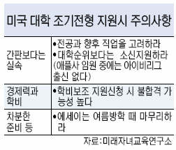 조기 전형(얼리 디시전) 제도를 채택하는 미국 대부분 대학들의 원서 마감은 11월 1일이다. 얼리 지원은 미국 대학에 진학하는 고등학교 3학년(미국 12학년) 학생들이 일생에 단 한번 쓰는 카드다. 이 카드를 어떻게 쓰느냐에 따라 인생이 바뀐다. 얼리 디시전은 합격을 했을 경우 그 대학에 꼭 등록을 해야 하는 의무가 부과된다. 따라서 갈까 말까 생각하는 대학에 지원을 해서는 안 된다.조기전형의 장점은 레귤러에 비해 합격률이 높다는 것이다. 지난해 얼리 제도를 택하지 않은 하버드와 프린스턴을 제외한 다른 아이비대학들을 보자. 예일대학은 레귤러 합격률이 5.6%인 데 반해 얼리 합격률은 18.1%다. 무려 12.5%포인트가 높다. 얼리가 정시보다 2배 이상 합격률이 높다. 컬럼비아대학은 정시 합격률이 8.4%인 데 반해 얼리 합격률은 23.1%다. 정시보다 2배 이상 높다.