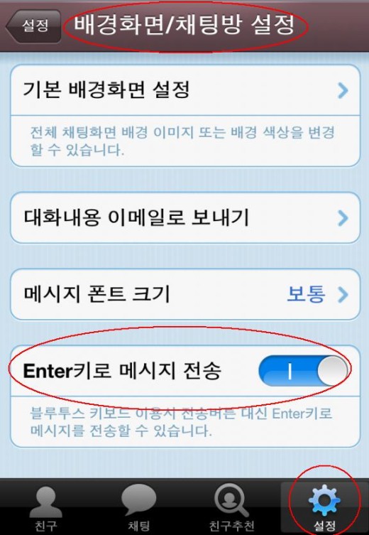 설정 방법은 각 메신저가 비슷하다. 카카오톡은 하단의 ‘설정’을 눌러 ‘배경화면/채팅방 설정’에 들어가 ‘Enter키로 메시지 전송’ 메뉴를 오른쪽으로 밀어 활성화시키면 된다.