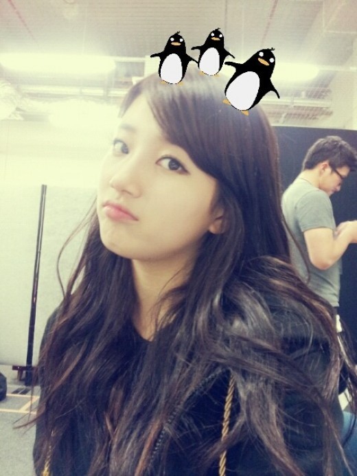공개된 사진 속에서 수지는 뾰루퉁하면서도 새초롬한 표정을 지은채 고개를 옆으로 젖힌 자세에서 카메라를 바라보고 있으며 머리 위에는 펭귄 3마리를 올려 보는 이들의 웃음을 자아냈다.