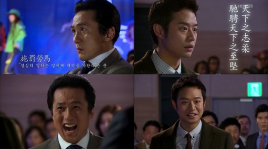 천정명은 천 번이나 고약한 짓을 한 놈이 몸이 마비 된다는 사자성어는 ‘천고마비(天高馬肥)’, 부하직원을 못 잡아먹어 안달인 직장상사를 일컫는 사자성어는 ‘시벌로마(施罰勞馬)’, 분수에 지나친 행동을 경계하라는 뜻의 ‘족가지마(足家之馬)’ 등 욕로로 들리는 듯 한 사자성어로 손창민을 비꼬며 통쾌한 복수전을 펼쳤다.