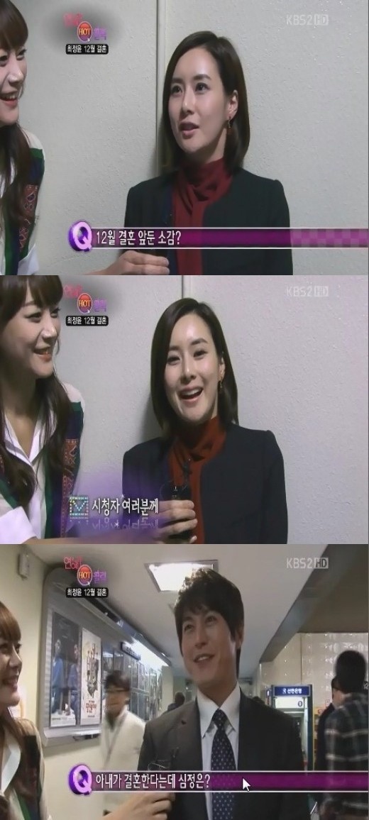 19일 방송된 KBS 2TV 연예정보 프로그램 ‘연예가중계’에서 최근 결혼을 발표한 최정윤과 진행한 인터뷰를 공개했다.