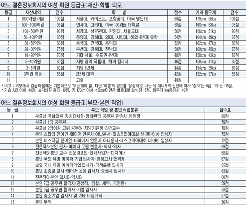 결혼정보회사의 회원 등급표가 또다시 나왔다. 남성에 이어 이번에는 여성이다.