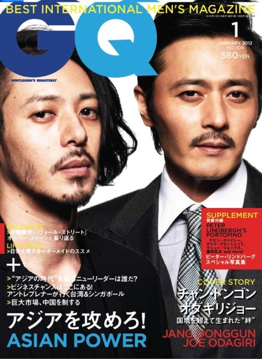 이번 GQ표지는 한국과 일본을 대표하는 두 미남의 만남으로, 장동건과 오다기리 조가 각기 다른 매력을 발산하며 여성들은 물론, 남성들의 시선까지 사로잡고 있다.