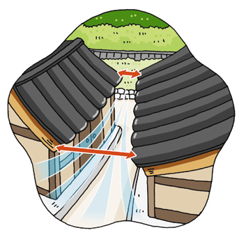 두 건물을 비스듬하게 놓으면 바람길의 양쪽 간격이 달라집니다. 남쪽이 넓고 북쪽이 좁죠. 이렇게 되면 길이 넓은 남쪽에서 들어온 바람이 좁은 북쪽 길로 빠져나갈 때 바람의 속도가 빨라져 더 시원한 바람이 붑니다. 반대로 북쪽에서 들어온 바람은 남쪽으로 빠져나가면서 속도가 느려지고 순해지죠.