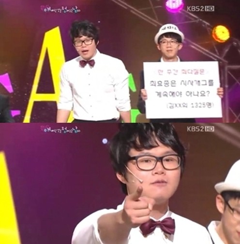 27일 방송된 KBS 2TV '개그콘서트-애정남' 에 출연한 최효종은 ‘최효종은 시사개그를 계속 해야하나요?’라는 질문에 대한 답을 했다.