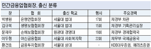 28일 금융권에 따르면 박병원 전 청와대 경제수석(행정고시 17회)이 은행연합회장에 30일 취임할 예정인데 이어 내달 초에 바뀌는 생명보험협회장에도 재경부 출신인 김규복 전 신용보증기금 이사장(행시 15회)이 내정됐다. 이로써 선거를 통해 뽑은 금융투자협회장을 제외하고 은행, 보험, 카드업계 대표 단체장들이 모두 재경부 출신들로 채워지게 됐다.