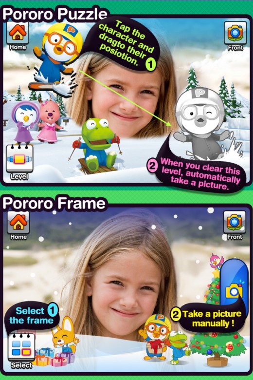 아이가 화면의 뽀로로 캐릭터들을 보고 노는 동안 타이머 기능으로 자연스러운 사진을 찍을 수도 있다. 간단한 학습 요소를 가미시켜 아이들이 흥미롭게 애플리케이션을 사용할 수 있도록 기획했다.