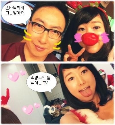 공개된 사진 속 사유리는 미소를 짓고 있는 박명수의 옆에서 개구진 표정으로 브이포즈를 취하고 있는가 하면 산타를 연상케 하는 의상을 입고 혀를 내밀고 있는 모습이다.