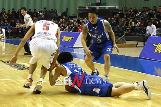 1일 오후 잠실실내체육관에서 ‘2011-2012 KB 국민카드 프로농구’ 서울 삼성과 서울 SK의 경기가 열린 가운데 삼성 이시준과 SK 김선형이 몸싸움 도중 넘어지고 있다.