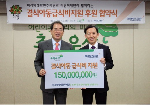 미래에셋박현주재단은 지난 4일 1억5000만원을 결식아동급식 후원금으로 전달했다. 이 기부금은 미래에셋 임직원들이 자발적으로 참여하고 있는 기부운동 '사랑합니다'를 통해 조성됐다.