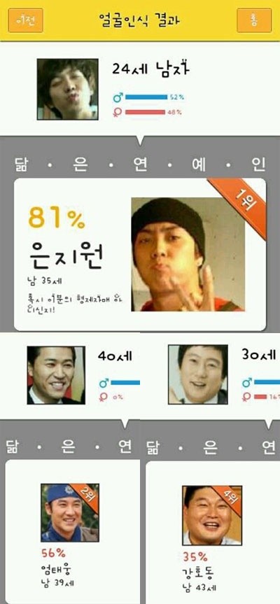 이번에 공개된 사진은 KBS 2TV ‘해피선데이-1박2일’ 출연진들의 스마트폰 ‘닮은꼴 찾기’ 얼굴 인식결과를 모아놓은 것으로 멤버들끼리 서로 닮은꼴로 인식된 모습이다.